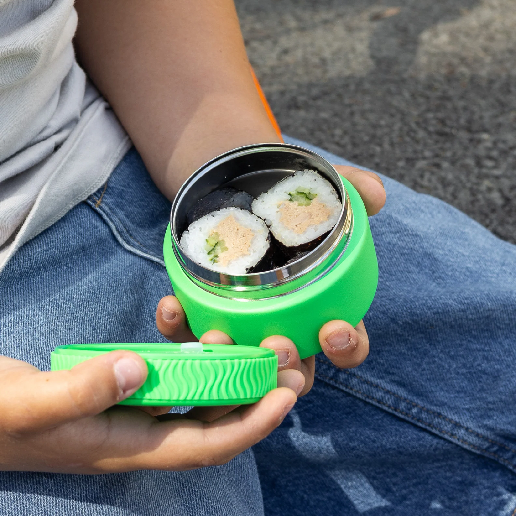 Made from durable stainless steel to survive the rough ’n’ tumble of the playground, with an easy-grip silicone band fitted to the lid for little hands to open.